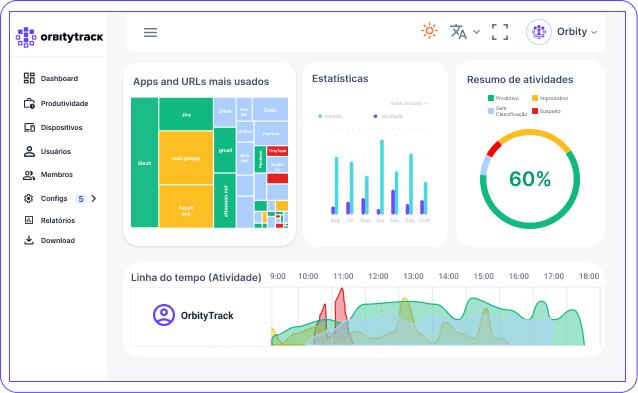 OrbityTrack reúne ferramentas essenciais para monitoramento, produtividade e gestão eficiente do tempo. Com insights valiosos e automação inteligente, sua empresa ganha mais controle, eficiência e resultados sem complicações.